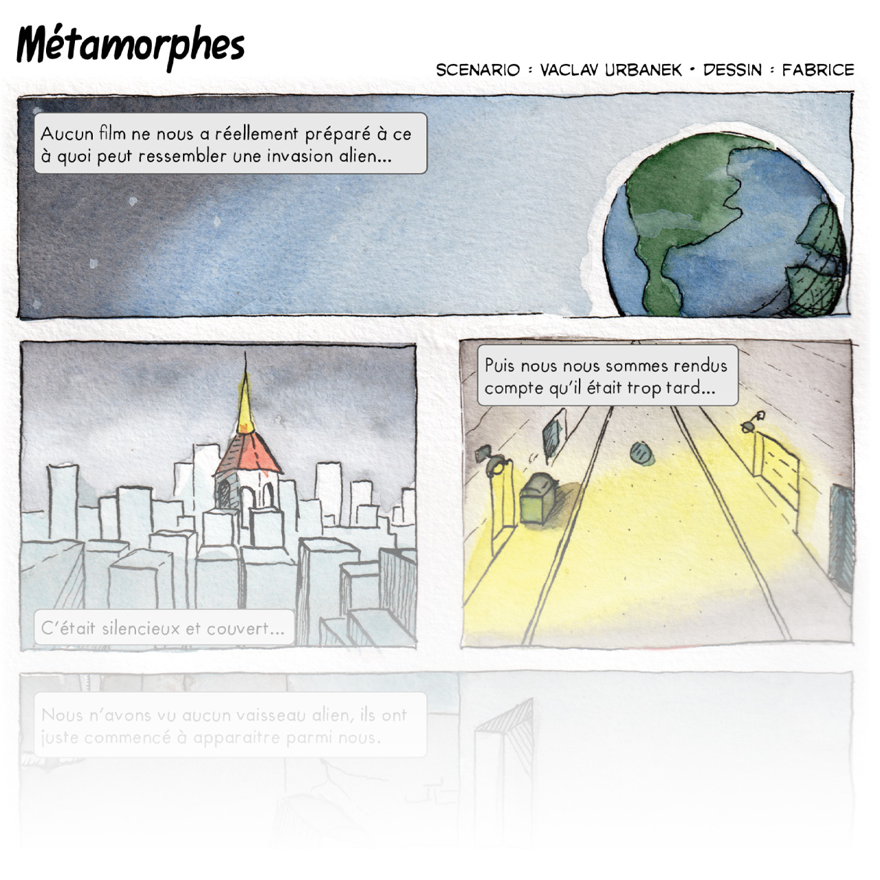 In April 2026, Fabrice let me know that the comic is finished as a part of the Zestes d'art #2 webzine (it's the very first comic in the linked PDF). The comic is in French, but you can compare it with my original script in English.